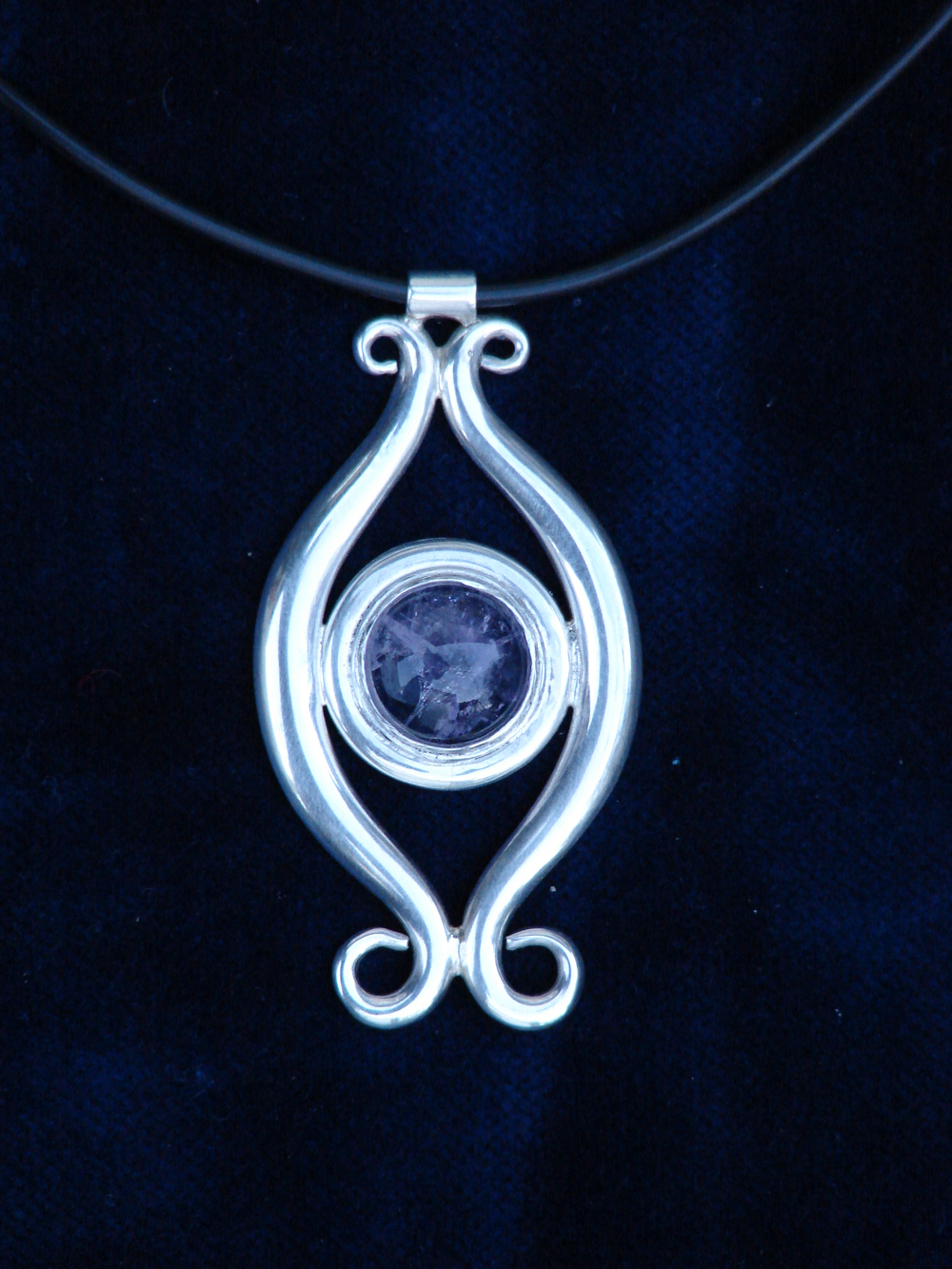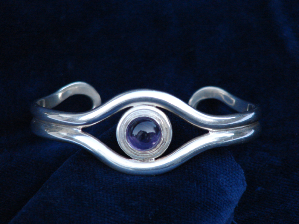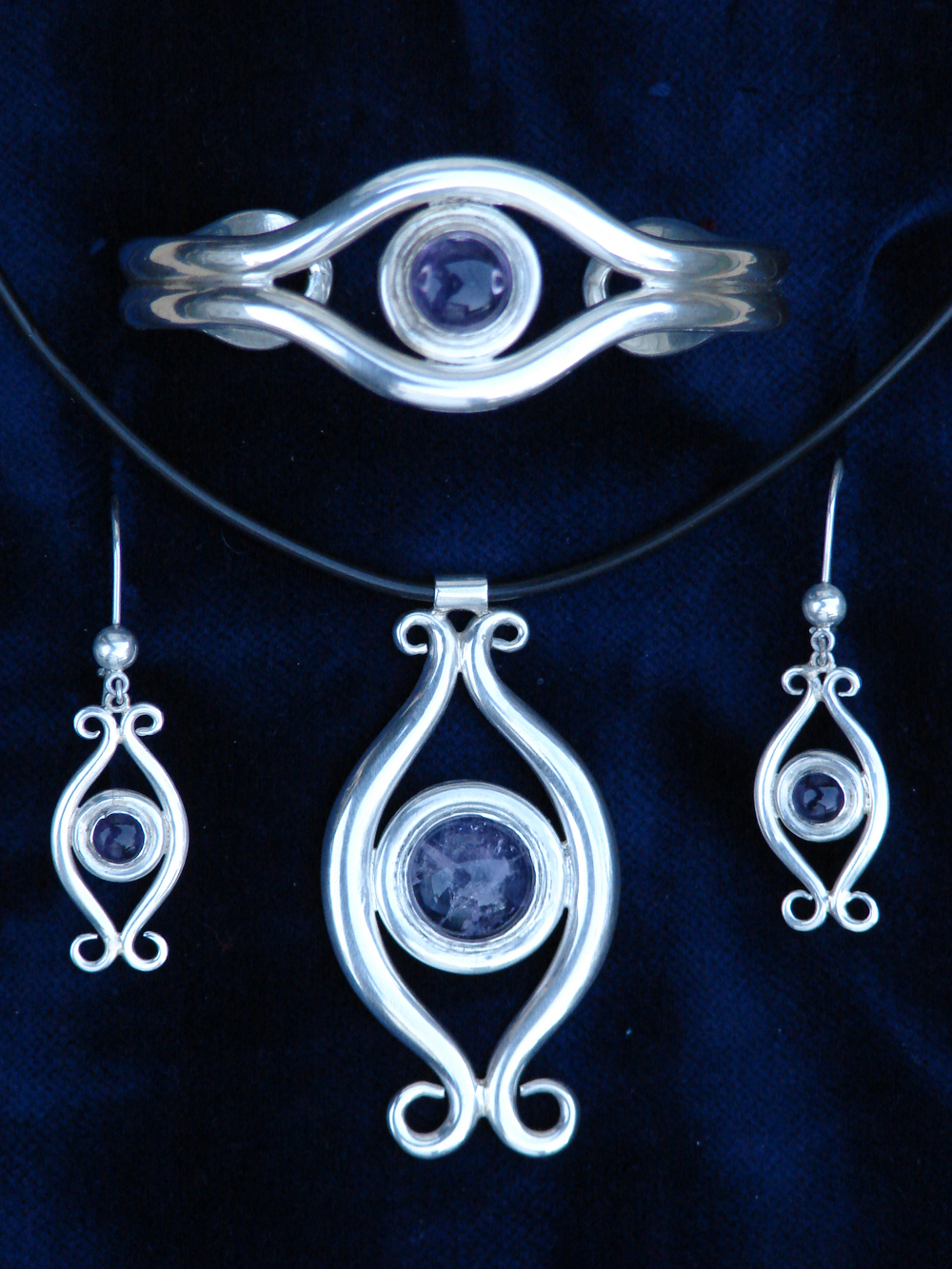 Ezüst ékszer kollekció: medál, fülbevaló, karkötő. A befoglalt kövek ametisztek. A karkötő két darab profil huzalból van kialakítva. A fülbevalók és a medál szintén hajlított és formára reszelt huzalokból készültek.