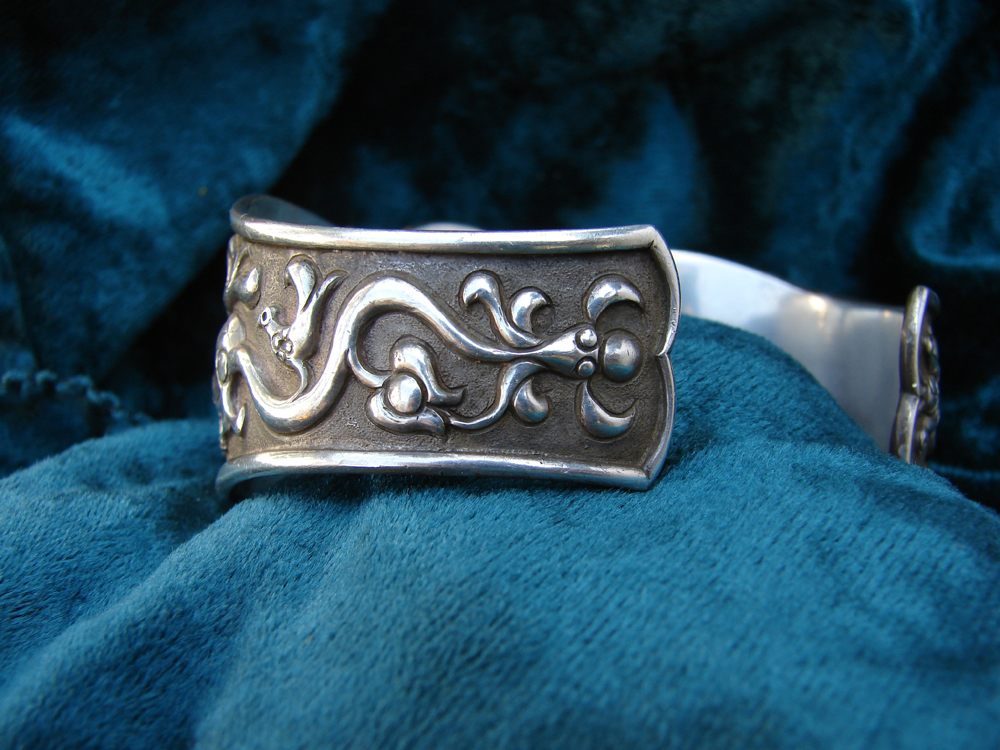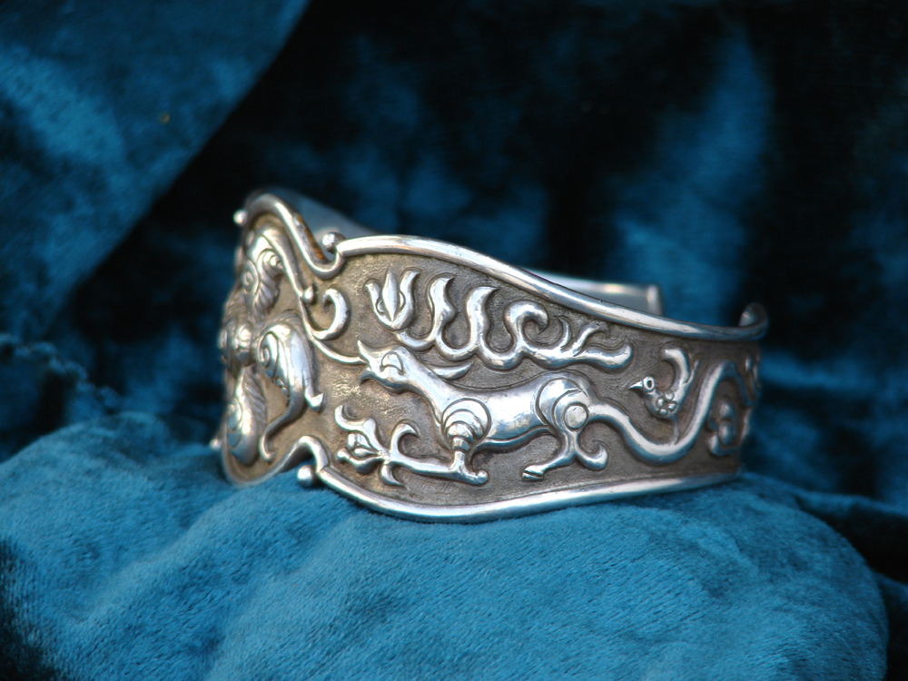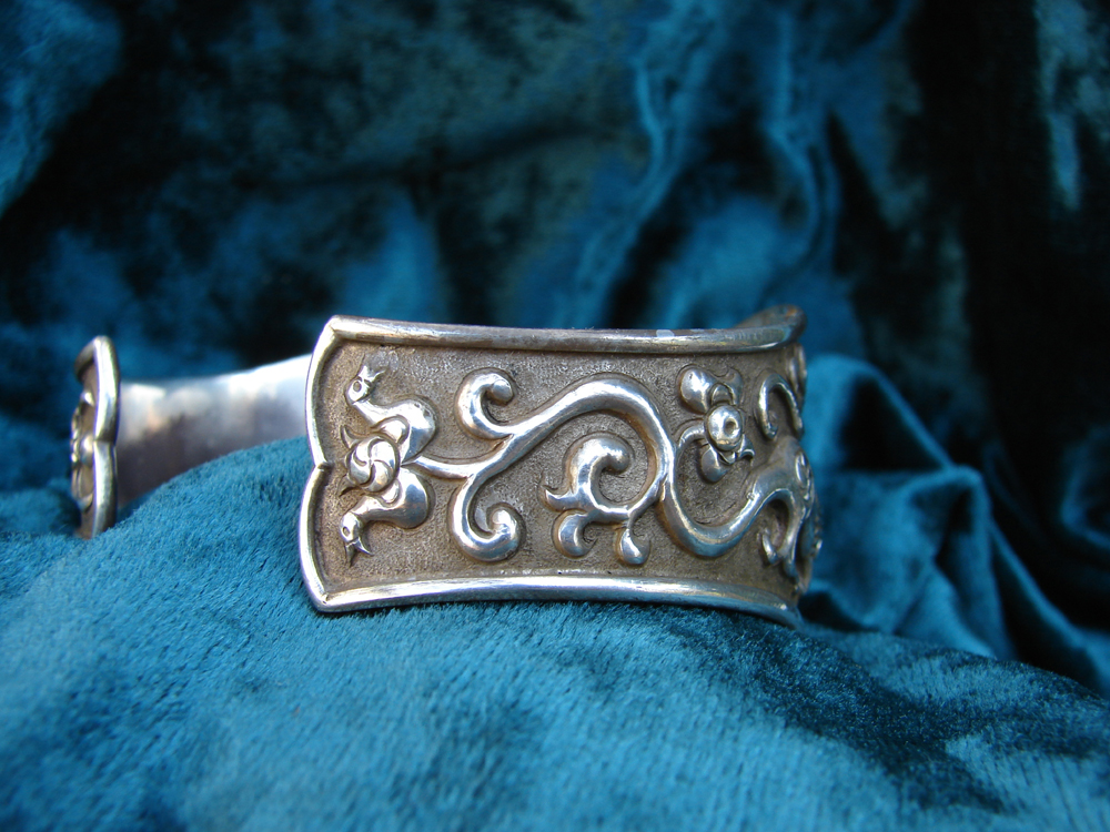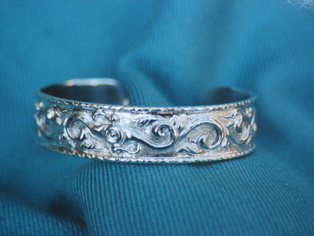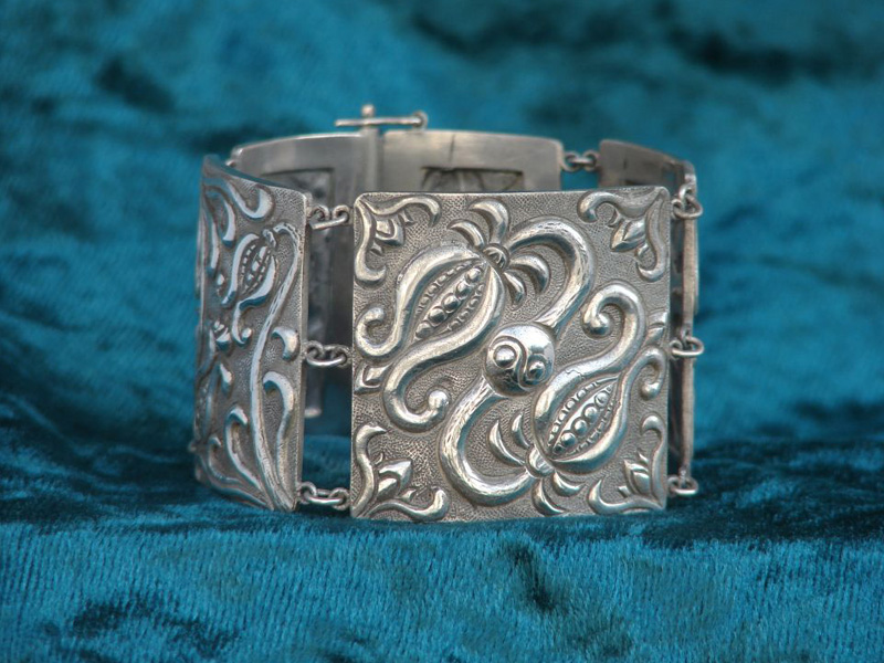 Cizellált ötvös karkötő. Anyaga ezüst. Hátlapján leforrasztott lemezzel. Kerete ,mely merevítésként is szolgál ,forrasztott sinhuzal.