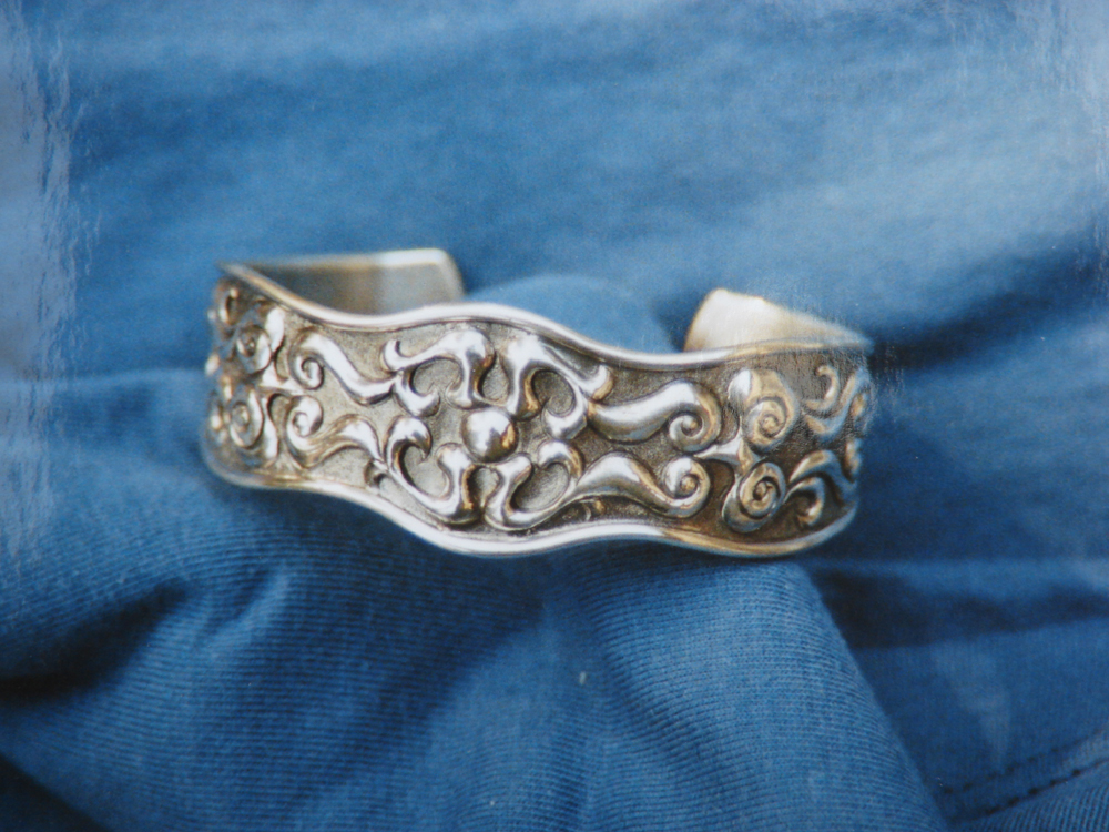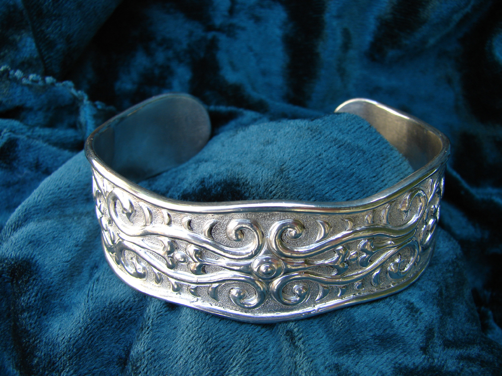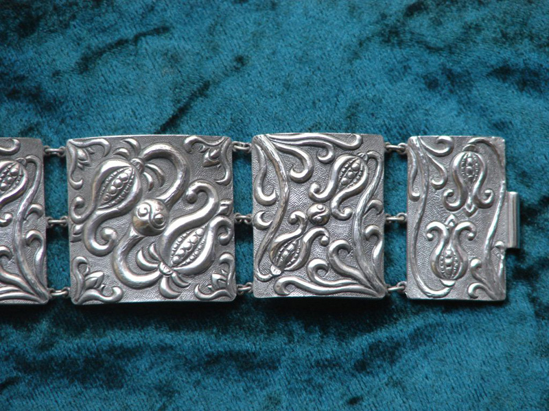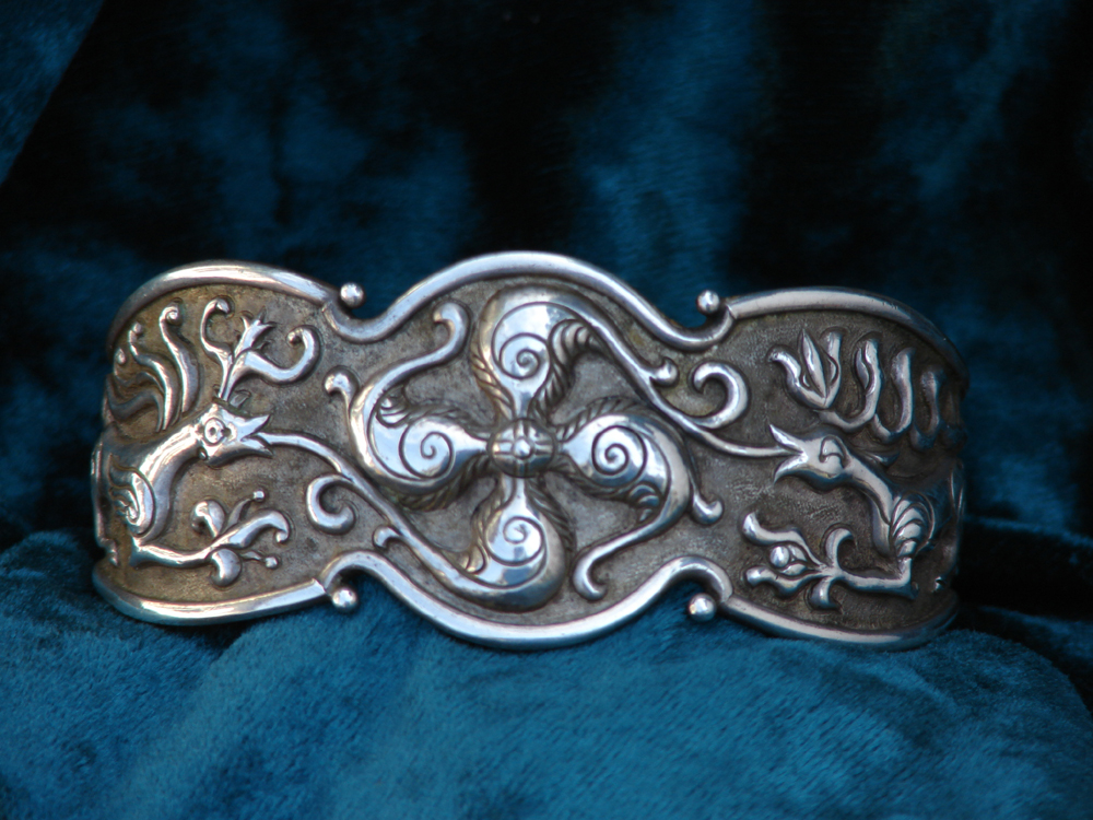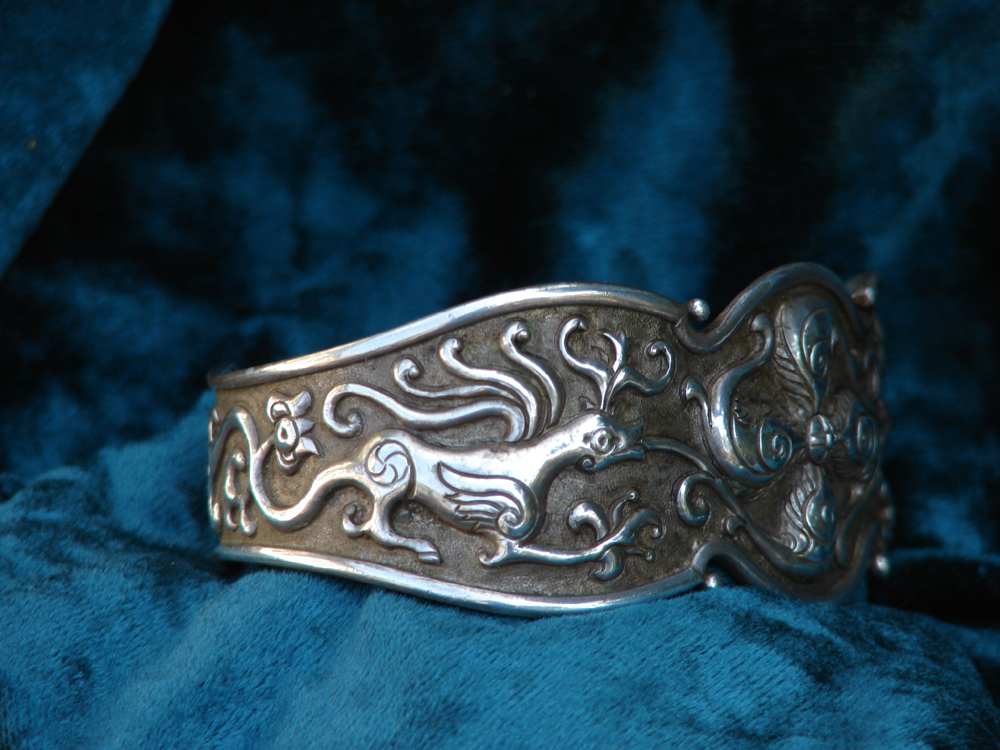 Cizellált ötvös karkötő. Anyaga ezüst. Hátlapján leforrasztott lemezzel. Kerete ,mely merevítésként is szolgál ,forrasztott sinhuzal.