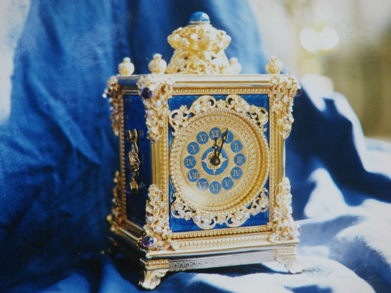 Barokk díszítésű asztali óra rátét mintákkal,vésett aljú ékszerzománccal.