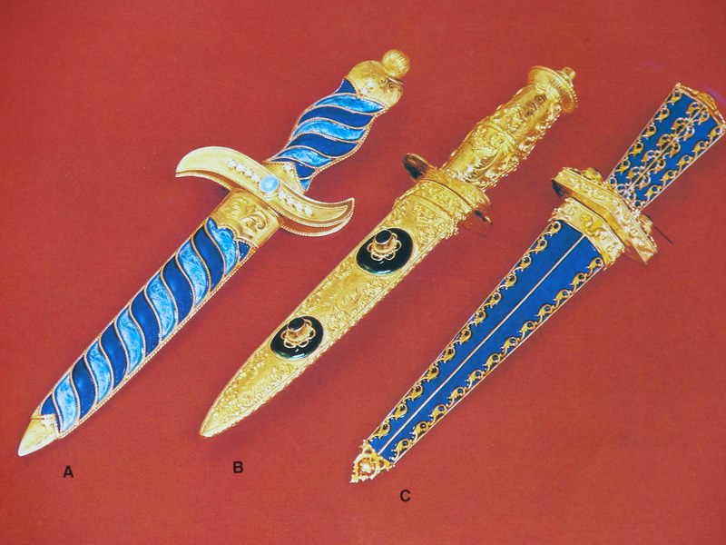 A tőrök pengéje : nikkelezett réz,melynek teljes felületét ornamentika borítja.