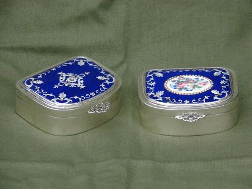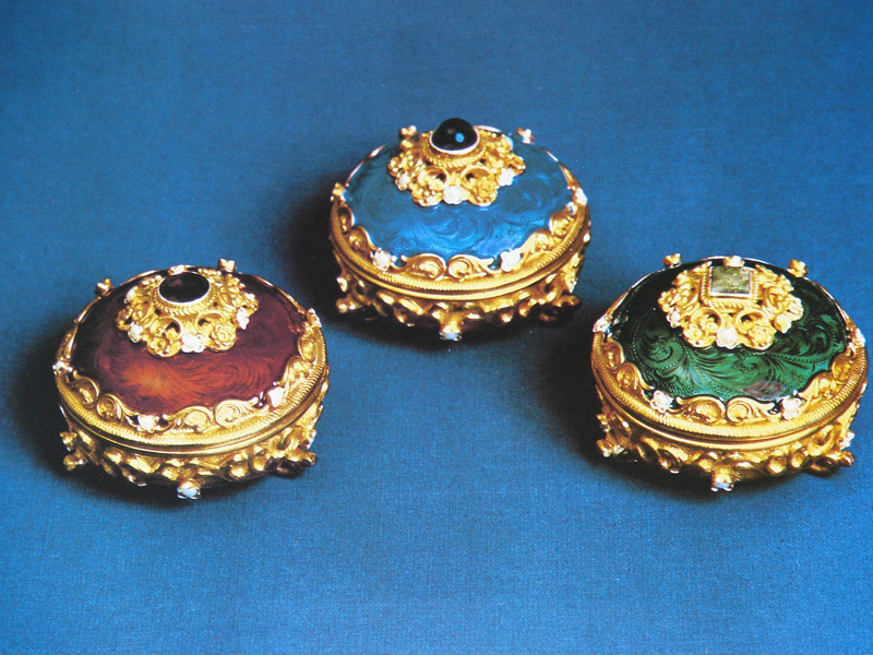 Ezüstből készültek,zsanérral nyitható fedelükön tűzzománcos betét-lemez,zárt foglalatban.